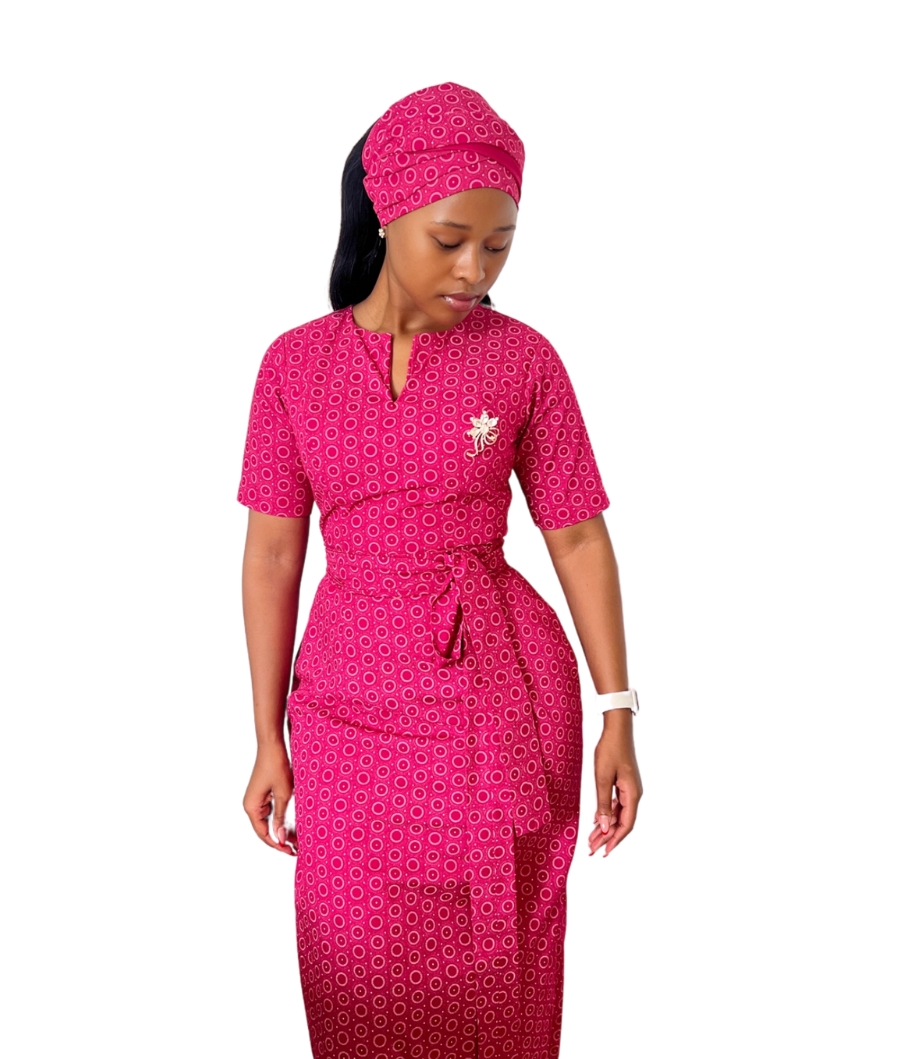 The dress comes with a belt and head wrap. Scarf and brooch are also available for sale