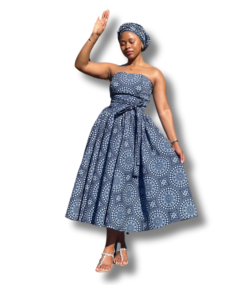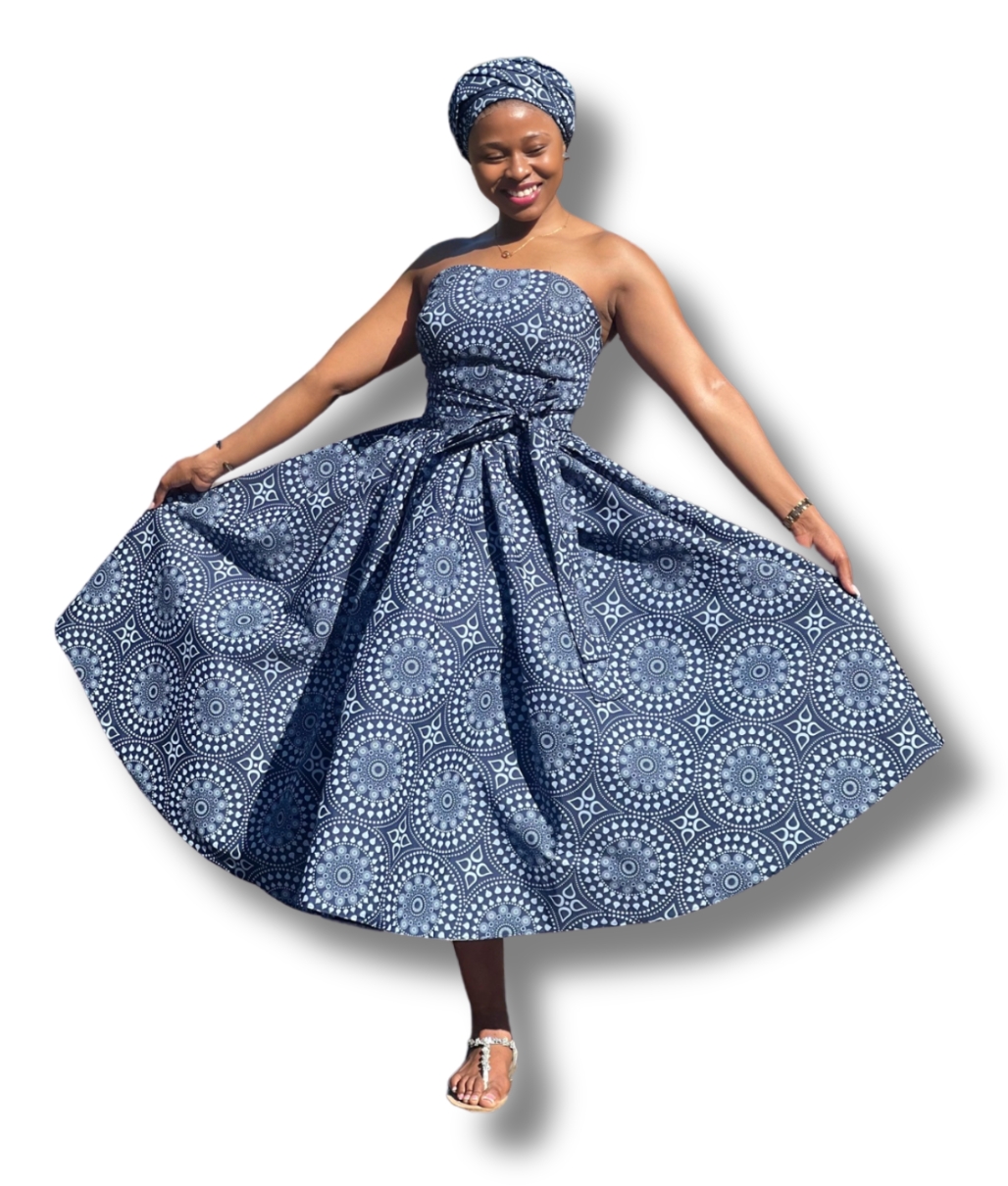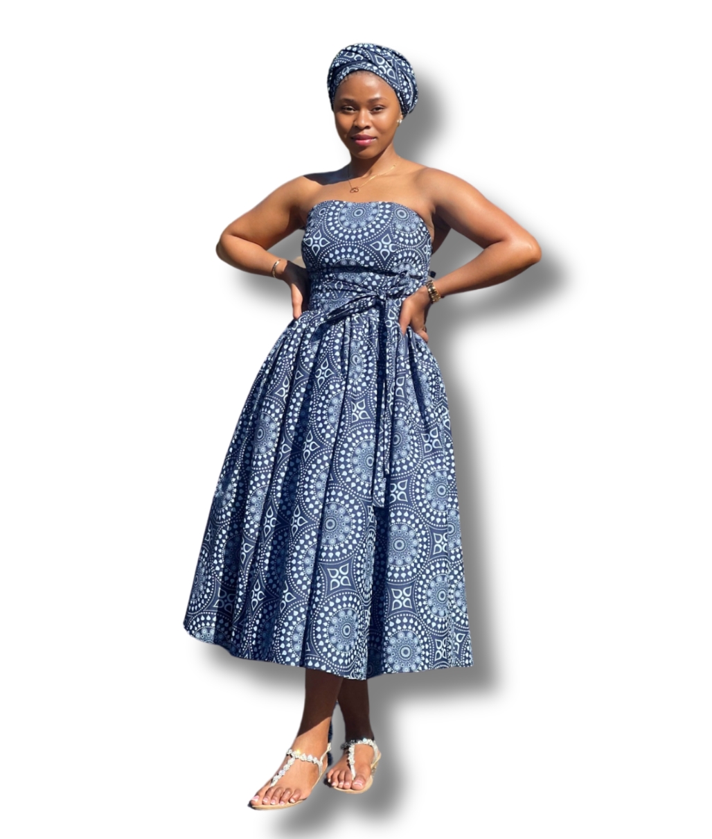 Sunrise blue three-piece dress comes with a belt and doek.  Available in different colours as well